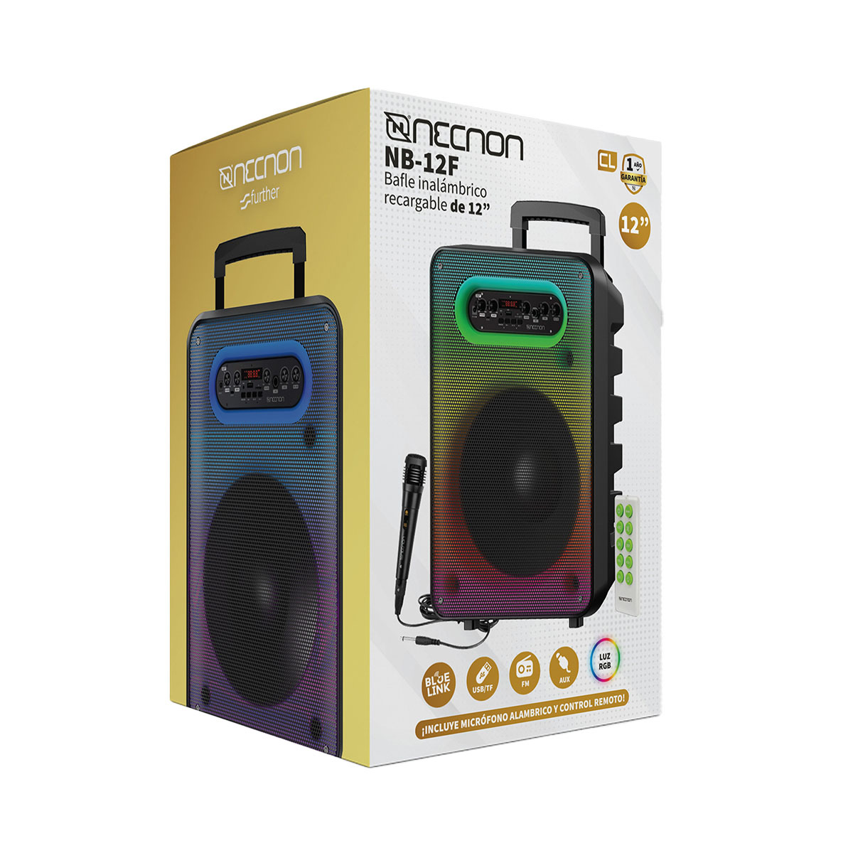 BOCINA INALAMBRICA NECNON (NCBB1201FL) BAFLE 12" RADIO FM USB AUX 3.5MM LUZ LED 16500 WATTS DISPLAY