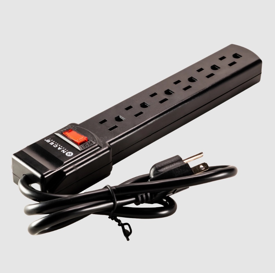 Barra multicontacto de 6 entradas con protección contra sobre tensión de 90 J, cable de 79 cm y carcasa de ABS resistente al fuego.